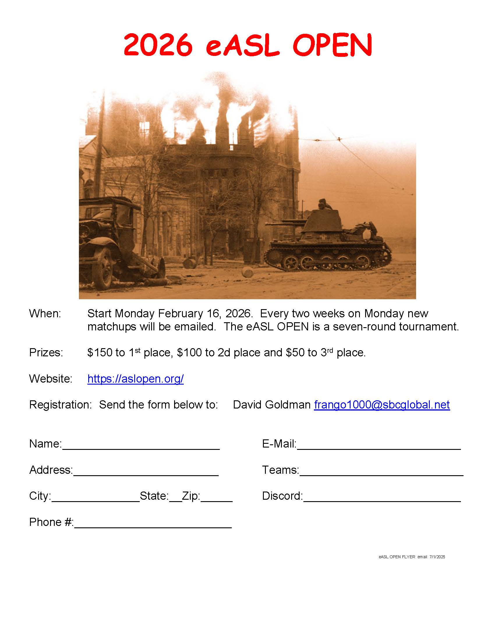 Home, Register & Rules The 2026 eASL OPEN will be held February 16 (first round starts) through May 25 (last round ends), two weeks each round. Seven rounds matched play. See the Registration Announcement Flyer and Tournament Rules: 2026 eASL OPEN Announcement Flyer 2026 eASL OPEN Rules V18